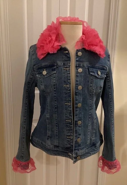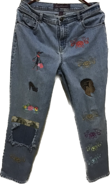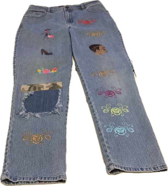 Blue Denim Jacket Embroidered With A Peacock, Roses And Leaves $75.00 Up Cycled Blue And White Denim Embroidered Jacket With A Poodle And Woman $75.00 Up Cycled Blue Denim Jacket Embroidered with a Woman and Pink Bows. $75.00 Up Cycled Blue Denim Jacket with Embroidery designs trimmed with Pink lace $75.00 White, Pink and Green Denim Jacket With Embroidered Flowers $75.00 Up Cycled Denim Jacket, Embroidered With A Geisha Girl And Peacock $75.00 Woman's Camouflage Vest With Embroidery Designs and Black Ruffles With Gold Stars $50.00 Up Cycled Denim Jacket With A Casino Theme $75.00 Up Cycled White Denim Jacket With Embroidered Panda's and Flowers $85.00 Up Cycled Blue Denim Jacket, Embroidered With Portraits of Two Women $75.00 Up Cycled Denim Jacket, Embroidered Woman With Headphones listening to Records $75.00 Up Cycle Blue Denim Jacket With Woman Meditating $75.00 Up Cycled Blue Denim Jacket, Embroidered With A Woman And Various Gold Flowers $75.00 Blue Jean Pants With Innovative Embroidery Designs $50.00